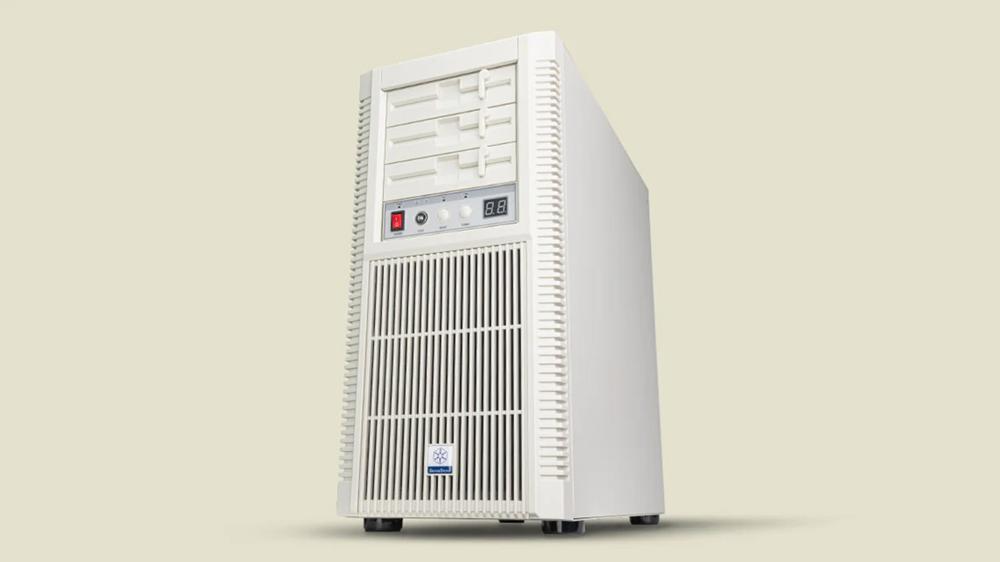 Новинка оформлена в светлых тонах, характерных для старой компьютерной техники, и оснащена тремя предустановленными вентиляторами. На передней панели есть три заглушки, оформленные под флоппи-диски...