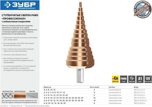 | Описание | Ступенчатые сверла ЗУБР специально разработаны для поэтапного сверления отверстий большого диаметра в различных металлических конструкциях и заготовках. |