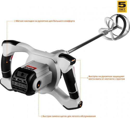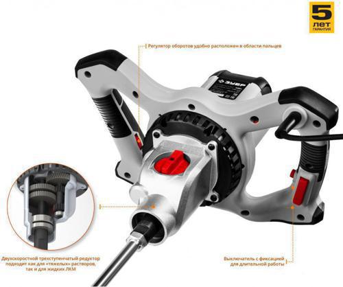 | Особенности | Новая модель в фирменном дизайне ЗУБР. Простой и надежный миксер для перемешивания различных растворов: двухскоростной редуктор для разных материлов, электронная регулировка частоты вращения для плавного изменения, эргономичная рукоятка для удобного хвата. |