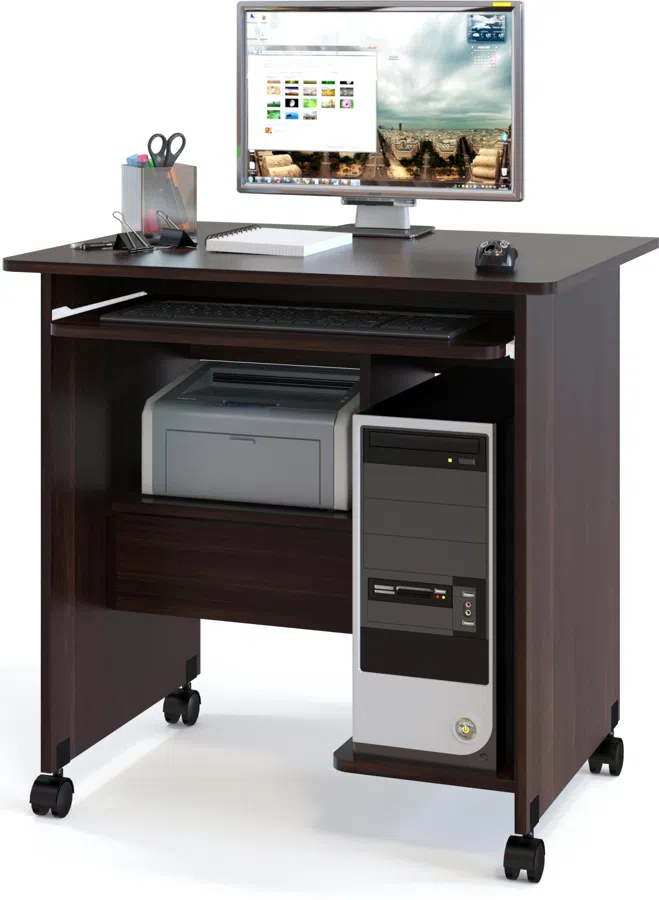 | Особенности | Компактный компьютерный стол на колесиках подойдет для работы как за ноутбуком, так и за полноценным компьютером. На внутренних полочках можно удобно расположить системный блок и даже небольшой принтер. |
