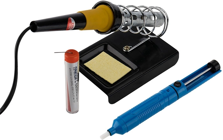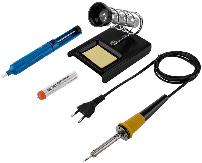 | Комплектация | Паяльник 30 Вт, Подставка, Спиралевидный держатель паяльника с хромовым покрытием, Оловоотсос (экстрактор припоя), Припой с канифолью в колбе. |