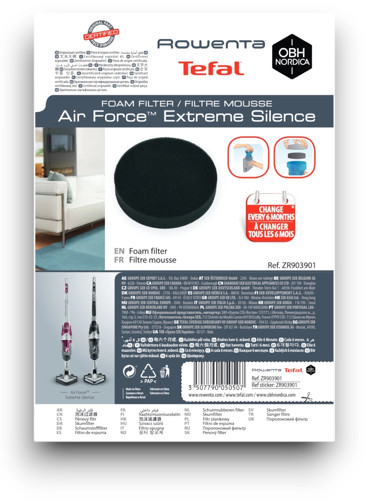 | Описание | Поролоновый фильтр для пылесосов Tefal Air Force Extreme Silence, Air Force Extreme RH885/RH887. |