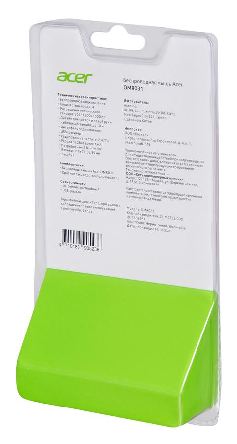 Мышь Acer OMR031 черный/синий оптическая 1600dpi беспров. USB 4but (ZL.MCEEE.008)
