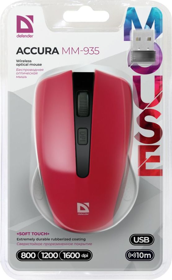 Мышь Defender Accura MM-935 красный оптическая 1600dpi беспров. USB для ноутбука 3but (52937)