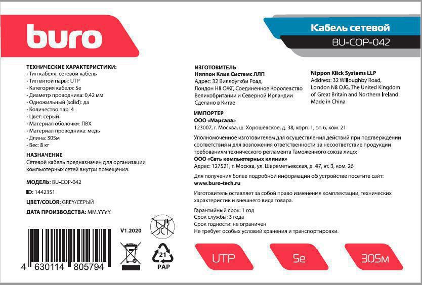 Кабель сетевой Buro BU-COP-042 UTP 4 пары cat.5E solid 0.42мм Cu 305м серый