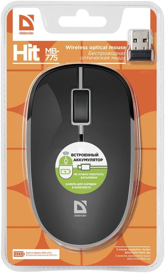 Мышь Defender Hit MB-775 черный оптическая (1600dpi) беспроводная USB для ноутбука (4but)