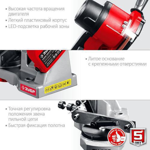 | Особенности | 2 диска разной толщины для различных типов пильных цепей. Компактный и мощный коллекторный двигатель. LED подсветка. Прозрачные экраны для защиты оператора от продуктов обработки. Быстрозажимная система фиксации цепи. Регулировка глубины точения. Возможность крепления к опорной поверхности. |