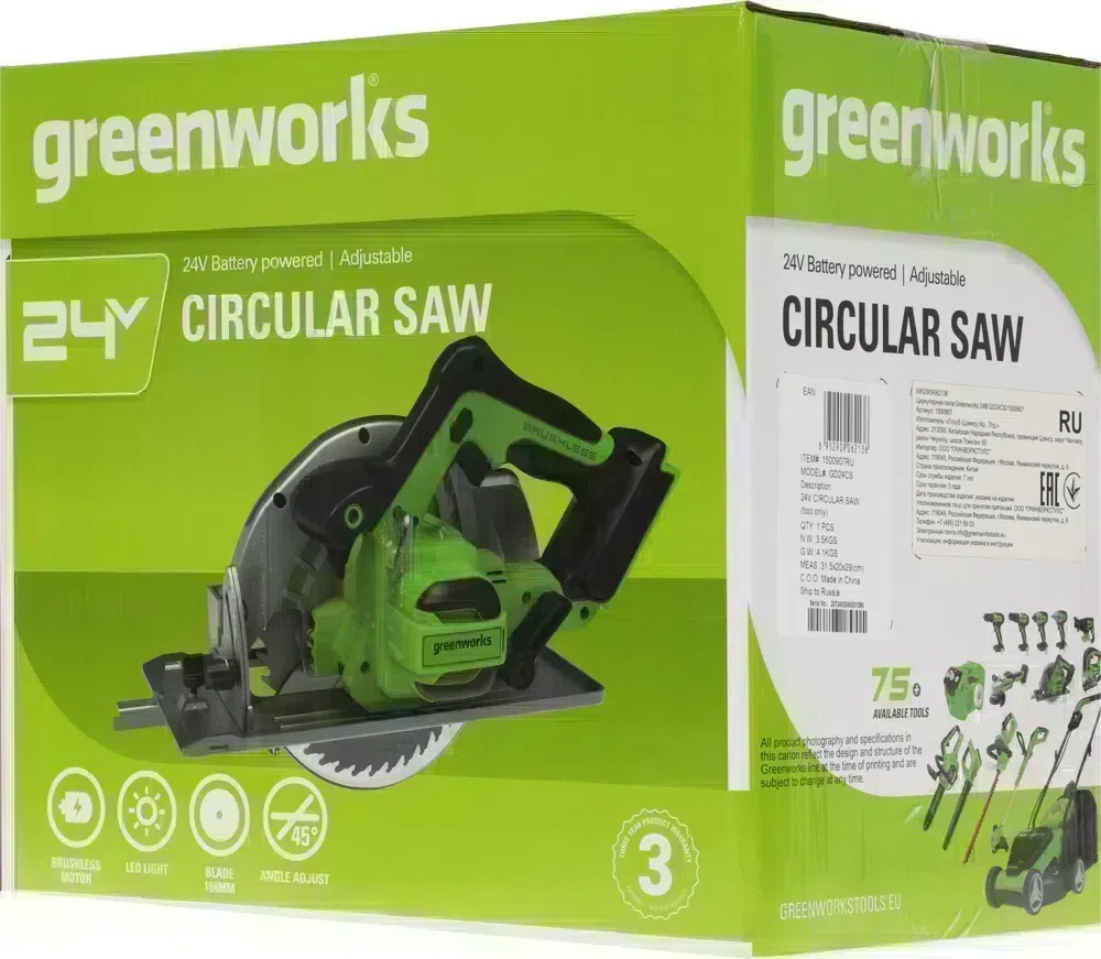 Циркулярная пила (дисковая) Greenworks GD24CS (ручная) D диска.:185мм (1500907)