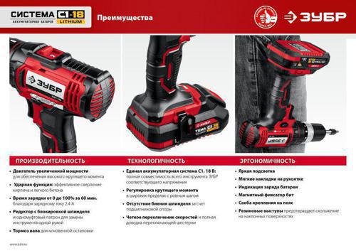 | Особенности | Ударная дрель-шуруповерт ЗУБР - универсальный инструмент для сверления бетона, кирпича, камня и заворачивания метизов. Значительный крутящий момент на первой скорости позволяет выполнять работу со сверлами и крепежом больших диаметров. |