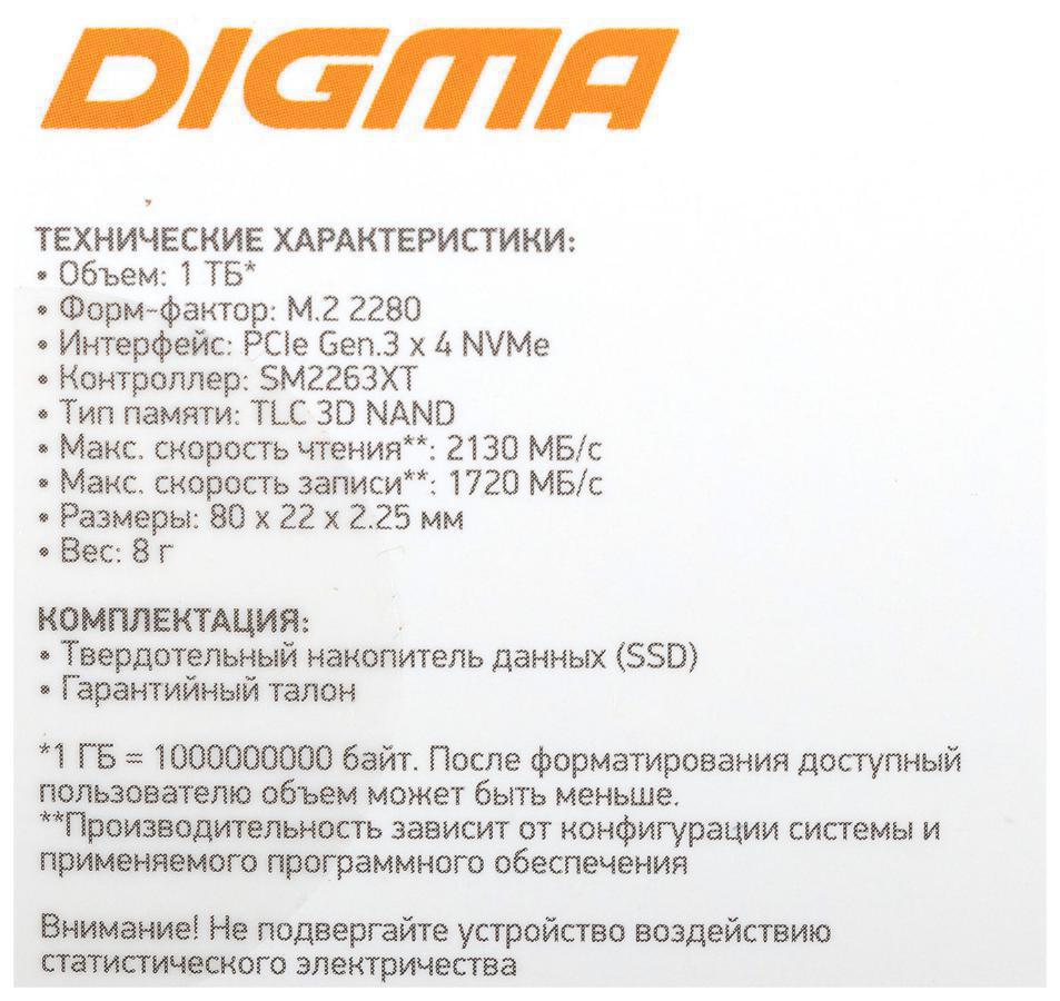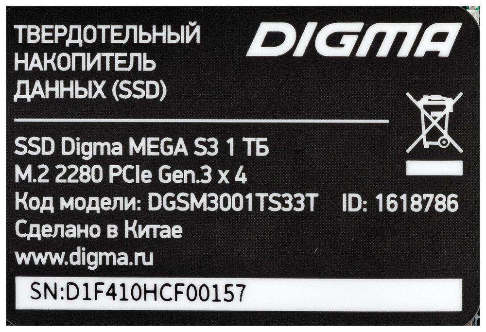 Накопитель SSD Digma PCIe 3.0 x4 1TB DGSM3001TS33T Mega S3 M.2 2280