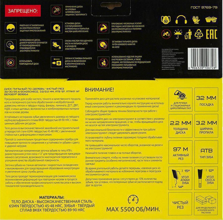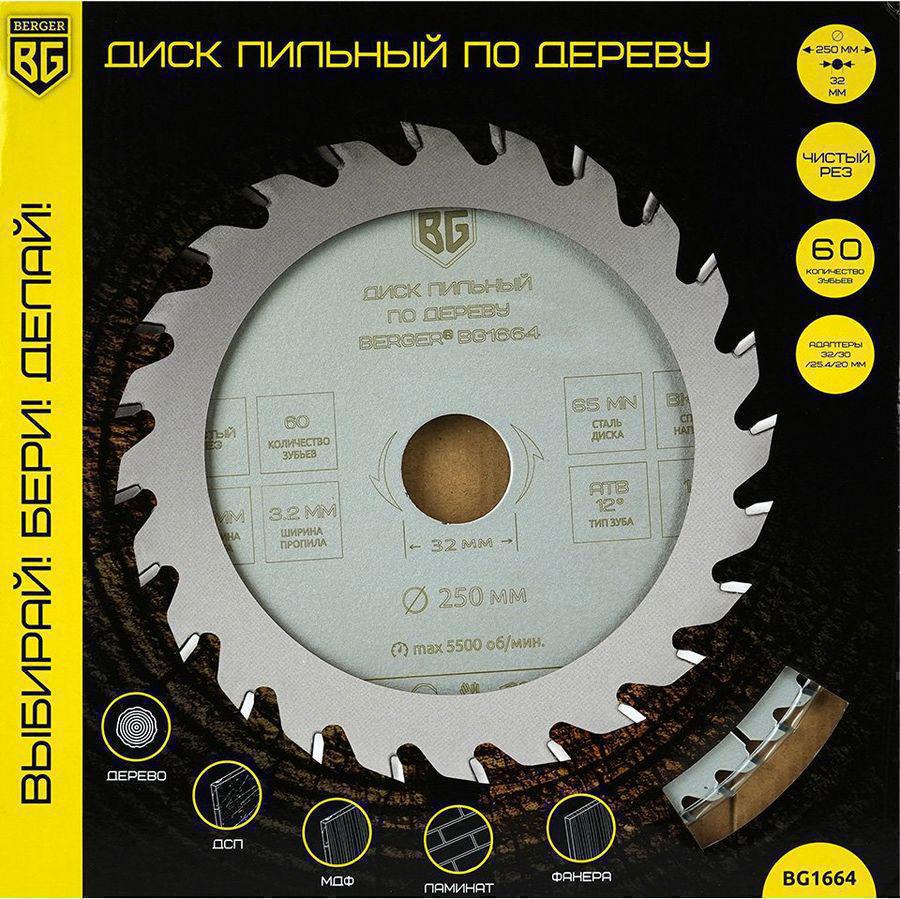 Диск пильный по дер. Berger BG1664 d=250мм d(посад.)=32мм (циркулярные пилы) (упак.:1шт)
