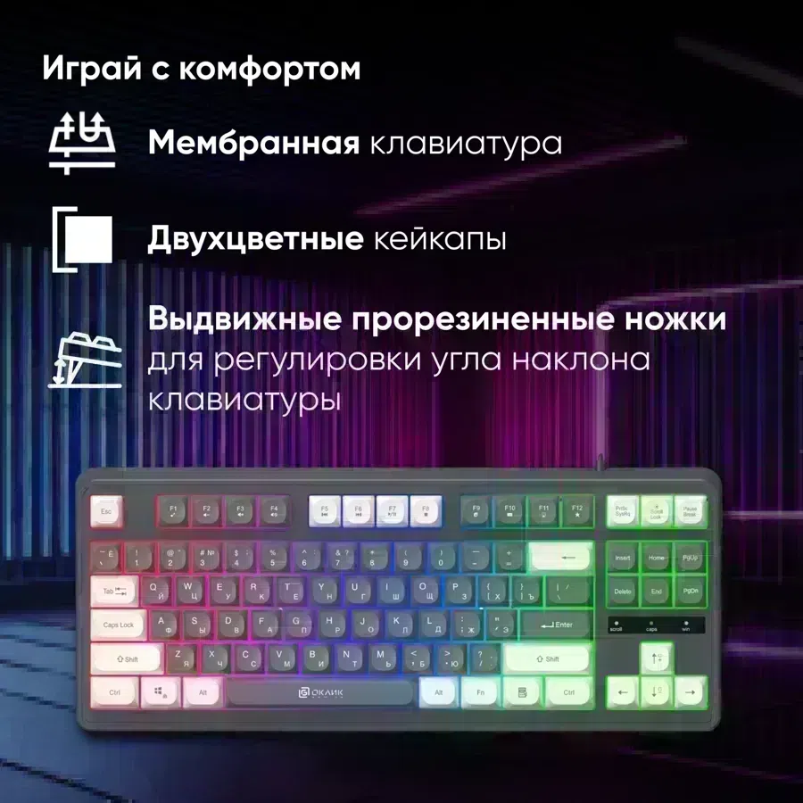 | Особенности | Формат: TKL, Материал: ABS, Подсветка: многоцветная, Кабель: 1.5 м с ферритовым фильтром, Особый шарообразный дизайн клавиш, Anti-Ghosting: 19 клавиш. |