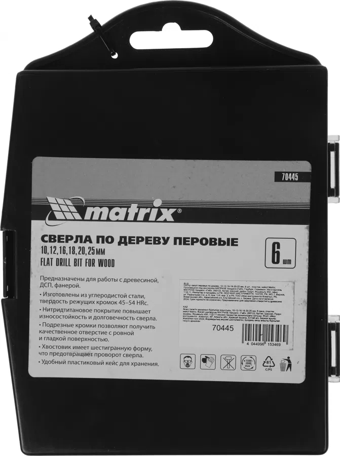 | Состав набора | Набор сверл перовых по дереву (6 шт, 10-12-16-18-20-25 мм.) MATRIX 70445 |