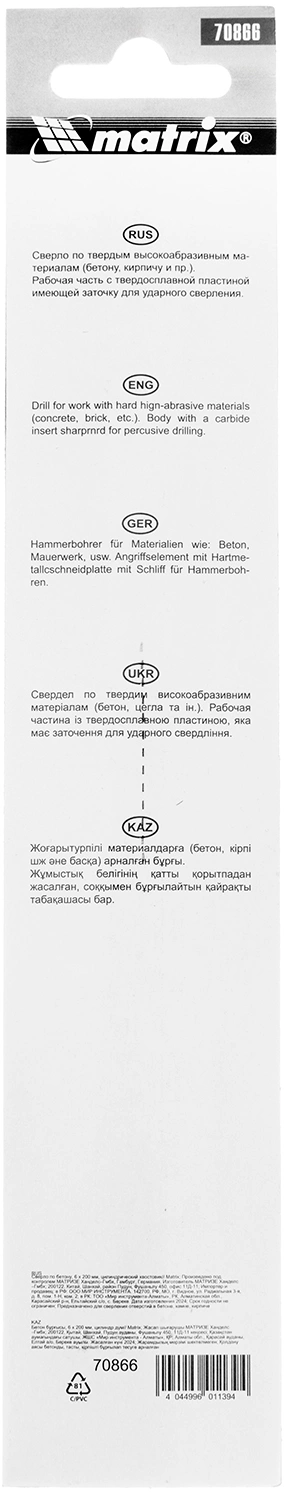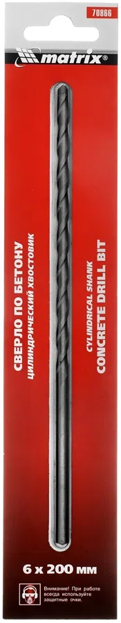 Сверло Matrix 70866 по бетону Д=6мм Дл=200мм (1пред.) для дрелей