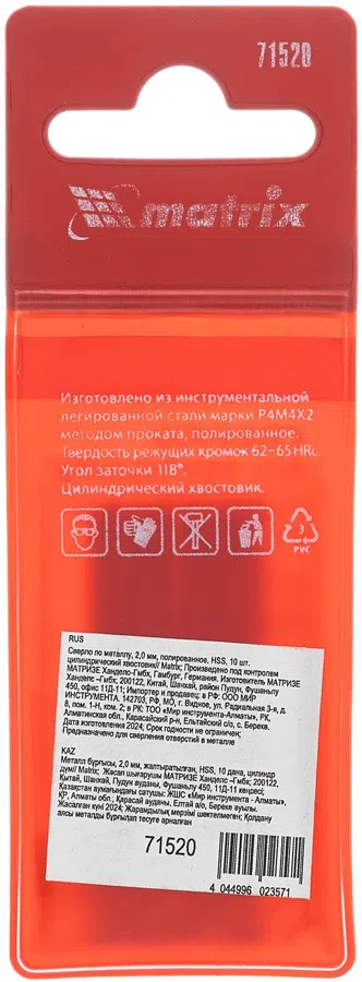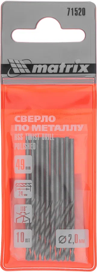 Сверло Matrix 71520 по металлу Д=2мм Дл=49мм (10пред.) для дрелей