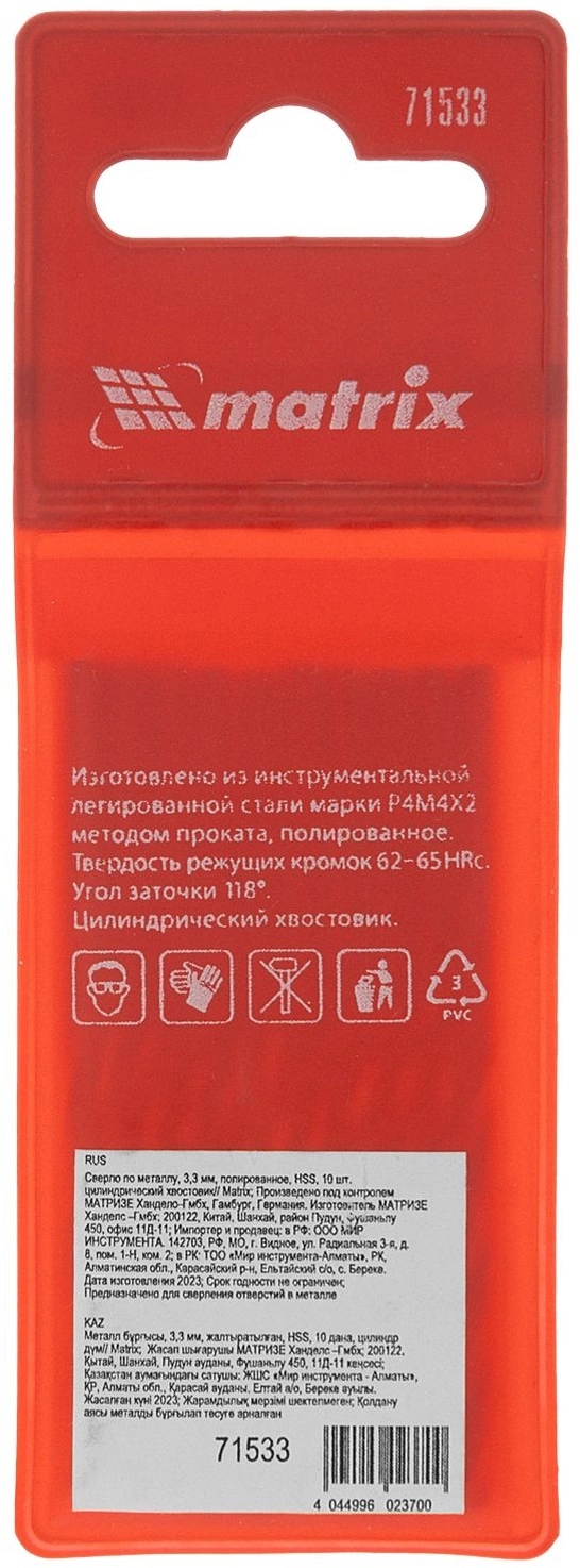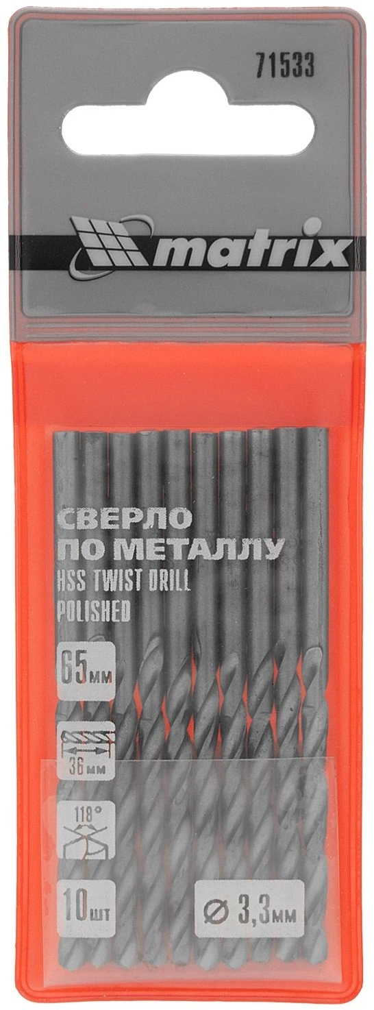 Сверло Matrix 71533 по металлу Д=3.3мм Дл=65мм (10пред.) для дрелей