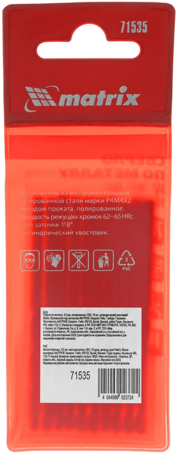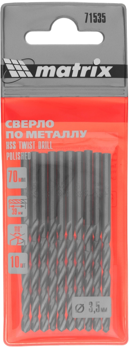 Сверло Matrix 71535 по металлу Д=3.5мм Дл=70мм (10пред.) для дрелей