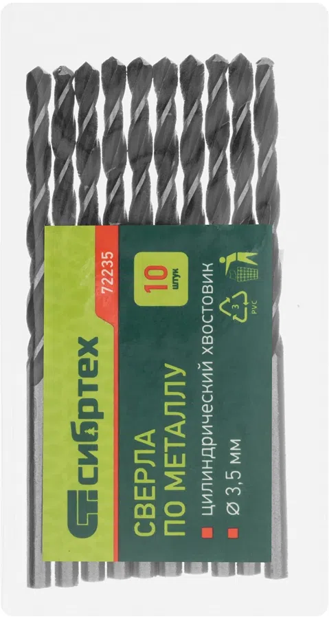 Сверло Сибртех 72235 по металлу Д=3.5мм Дл=70мм (10пред.) для дрелей