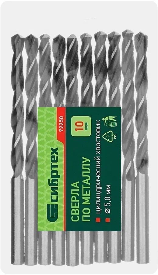 Сверло Сибртех 72250 по металлу Д=5мм Дл=86мм (10пред.) для дрелей