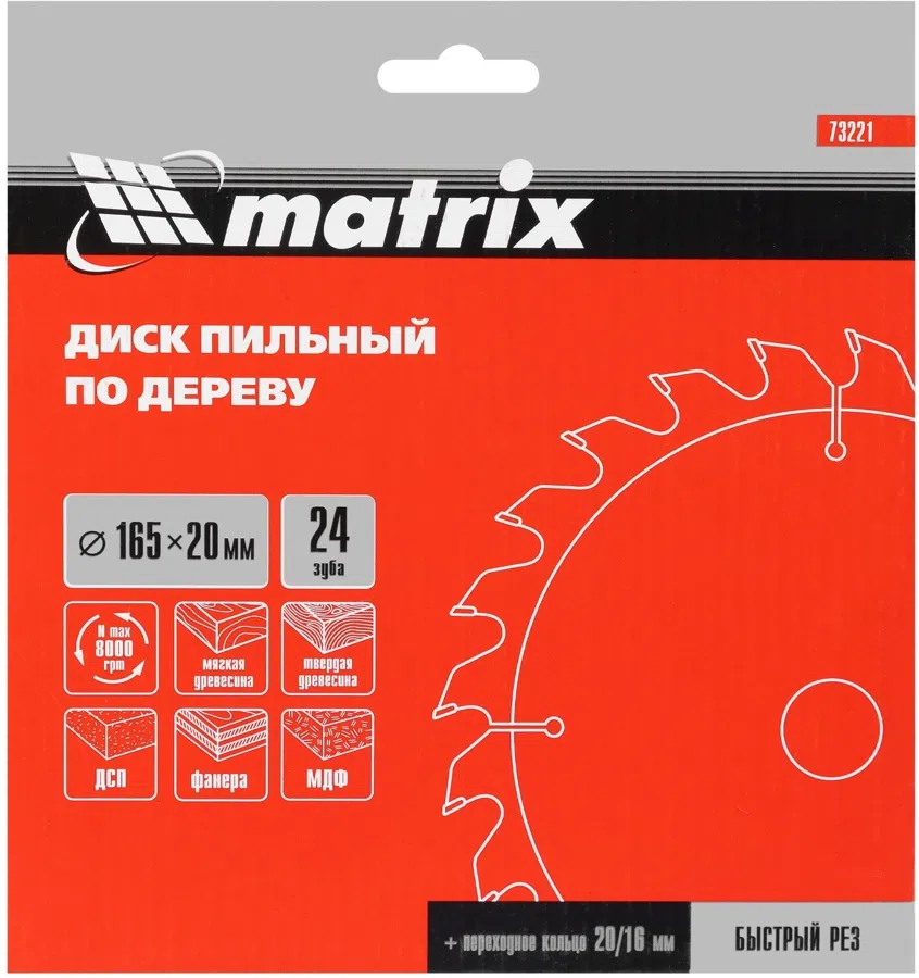 Диск пильный по дер. Matrix 73221 d=165мм d(посад.)=20мм (циркулярные пилы)