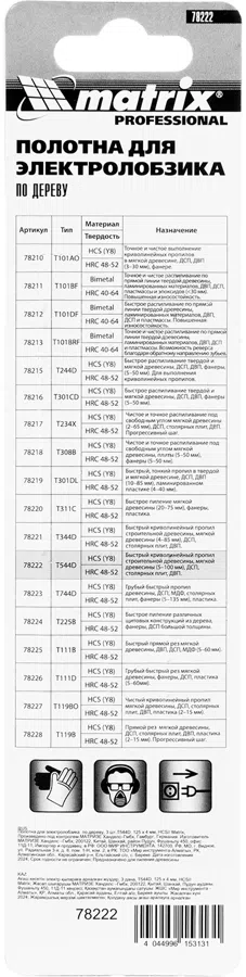 | Особенности | Полотна для электролобзика по дереву, 3 шт. T544D, 125 x 4 мм., HCS. |