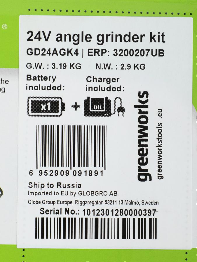 | Комплект поставки | Угловая шлифовальная машина (болгарка) Greenworks 24V, арт. 3200207, боковая рукоятка, ключ для монтажа диска, аккумулятор Greenworks, 24V, 4 Ач, зарядное устройство Greenworks 24V, 4А, руководство по эксплуатации, гарантийный талон, удобная сумка-переноска. |