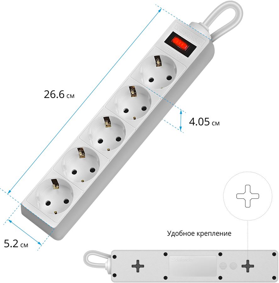 | Особенности | Автоматический предохранитель, встроенный в выключатель. Защита от перегрузки и короткого замыкания. Защита от импульсных помех. Индикатор сети. Крепление на стену. Корпус из негорючего пластика. |