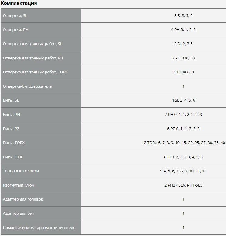 | Комплектация бит | набор бит H/HEX (шестигранник), набор бит Ph (крест), набор бит Pz (крест), набор бит SL (шлиц), набор бит Torx |