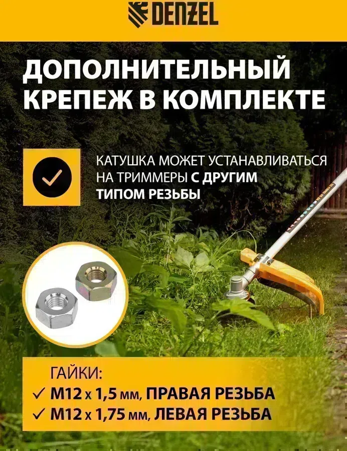| Описание | Полуавтоматическая триммерная катушка Denzel 96395 имеет посадочный размер M10 с левой резьбой 1,25 мм и комплектуется адаптерами M12 с шагом резьбы 1,5 и 1,75 мм. Устанавливается на вал электрического или бензинового триммера и используется для ухода за озелененными территориями. |