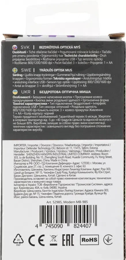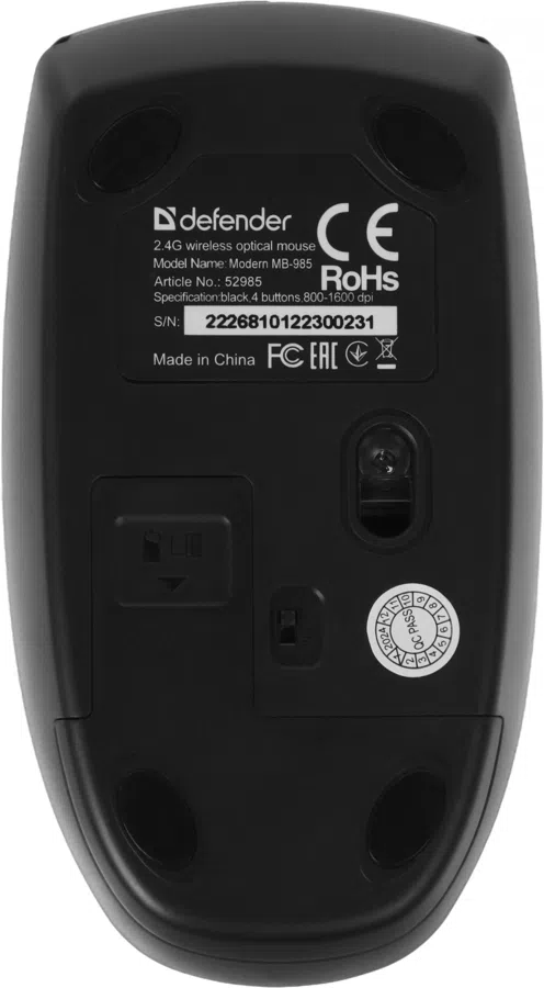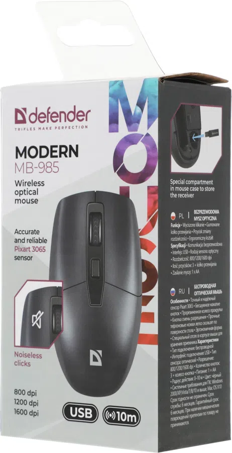 Мышь Defender Modern MB-985 черный оптическая 1600dpi беспров. USB 3but (52985)