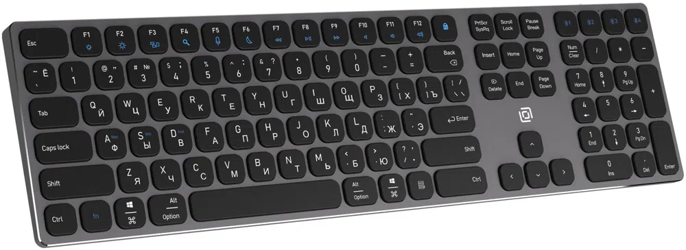 | Особенности | Ножничный механизм клавиш, проводное USB-подключение, беспроводное 2,4 Ггц + 3 Bluetooth канала. Аллюминиевый корпус. |