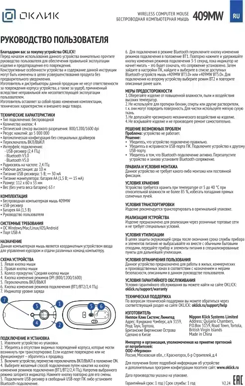 | Особенности | Поддержка трех устройств - 2.4G + BT + BT, slim дизайн, бесшумные клавиши, широкое резиновое колесо, кнопка вкл/выкл на нижней поверхности |
