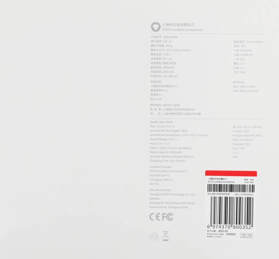 | Комплект поставки | Отвертка, 10 бит (PZ2, PH1, PH2, H3, H4, H5, SL5, T25, 2.3, TW1) - 50 мм., кабель зарядки Type-C, кейс для хранения, инструкция. |