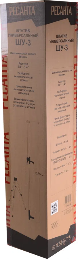 | Особенности | Максимальная высота - 3650 мм. Предназначен для построителей лазерных. Встроенный пузырьковый уровень. Замки-фиксаторы для регулировки штатива. Разборная телескопичекая штанга. Комплектация: тренога, штанга, передвижной фиксатор, упорная пятка, чехол-сумка. |