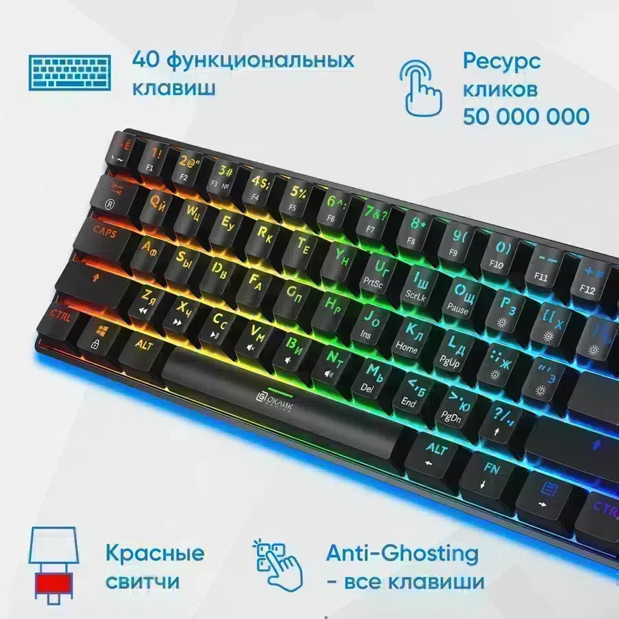 | Особенности | Компактная механическая клавиатура с реализованной технологией Hot-Swap. Яркая RGB-подсветка с возможностью настройки. Свитчи красные линейные (Huano) |