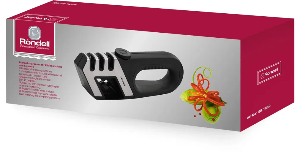| Описание | К вашим услугам три вида точильной поверхности: вольфрамовая сталь, стержень с алмазным напылением, а также керамический стержень. Угол заточки можно регулировать по желанию (19–40 градусов). Для ножниц в устройстве предусмотрен специальный стержень с алмазным напылением. |