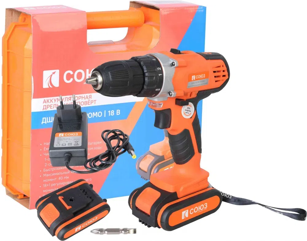 Дрель-шуруповерт Союз ДШС-18-2К-ПРОМО аккум. патрон:быстрозажимной (кейс в комплекте)