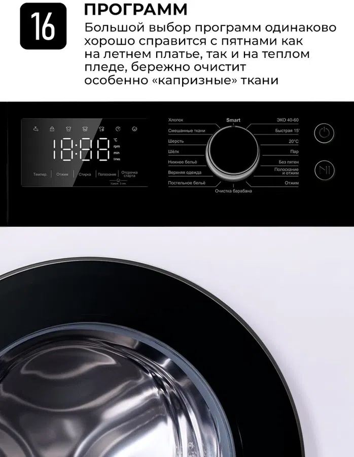 | Программы | Eco, постельное белье, пятновыведение, смешанные ткани, хлопок, шелк, шерсть |