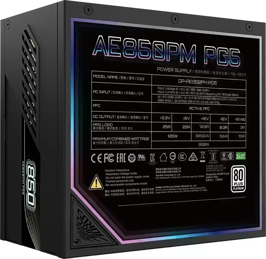 Блок питания Gigabyte ATX 850W Aorus Elite GP-AE850PM PG5 Gen.5 80+ platinum (20+4pin) APFC 120mm fan 8xSATA Cab Manag RTL