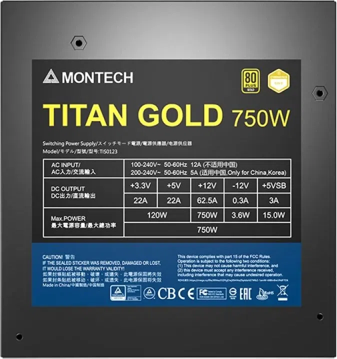 Блок питания Montech ATX 750W TITAN GOLD Gen.5 80+ gold (20+4pin) APFC 135mm fan 12xSATA Cab Manag RTL
