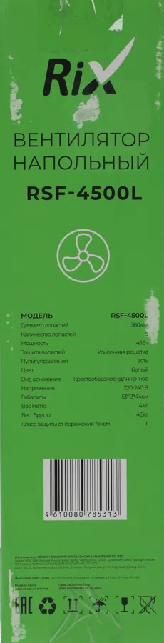 Вентилятор напольный RIX RSF-4500L 45Вт скоростей:3 ПДУ белый