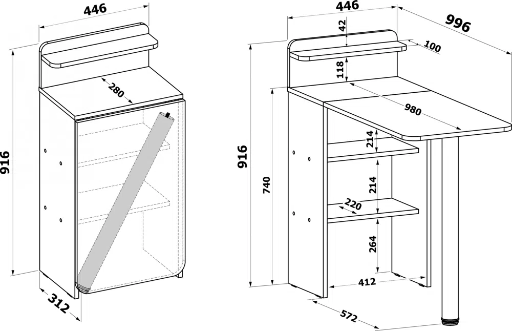 | Особенности | Материал: ЛДСП 16 мм с кромкой ПВХ 0.4 мм., Размер в разложенном виде (ВхШхГ): 916 х 996 х 446 мм., Максимальная нагрузка на столешницу: 20 кг., Максимальная нагрузка на полку: 5 кг., Ориентация сборки: только так, как представлено на изображении. |