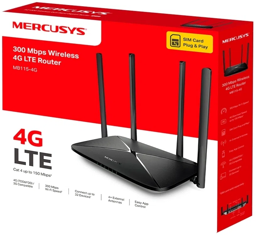 Роутер беспроводной Mercusys MB115-4G N300 10/100BASE-TX/4G cat. 4 черный