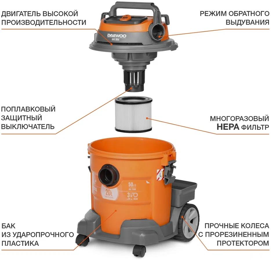 Строительный пылесос Daewoo DAVC 2514S 1400Вт (уборка: сухая/влажная/выдув/сбор воды) серый