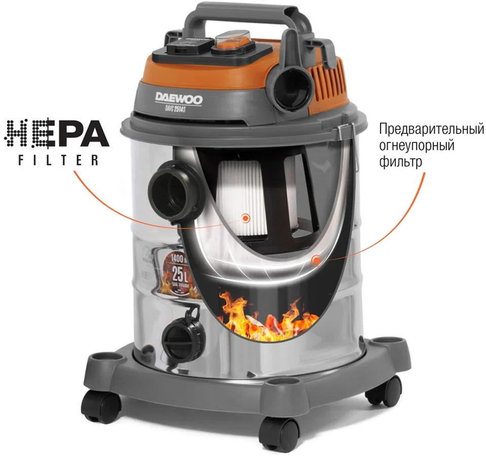 Строительный пылесос Daewoo DAVC 6025S 2500Вт (уборка: сухая/сбор воды/выдув) оранжевый