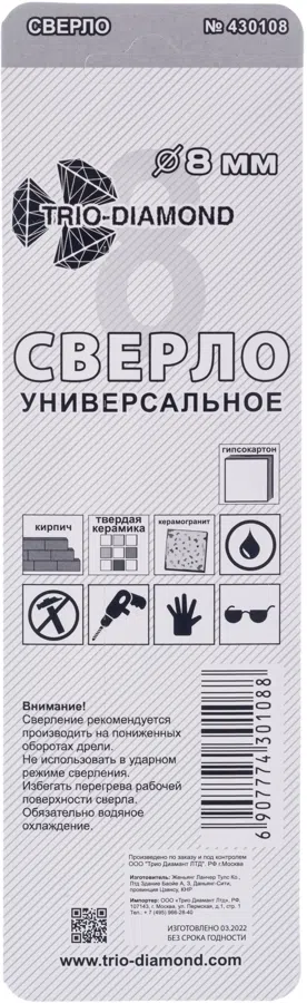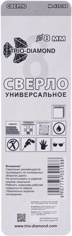 Сверло Trio-Diamond 430108 по керамогр/плит/кирп Д=8мм для дрелей/перфораторов