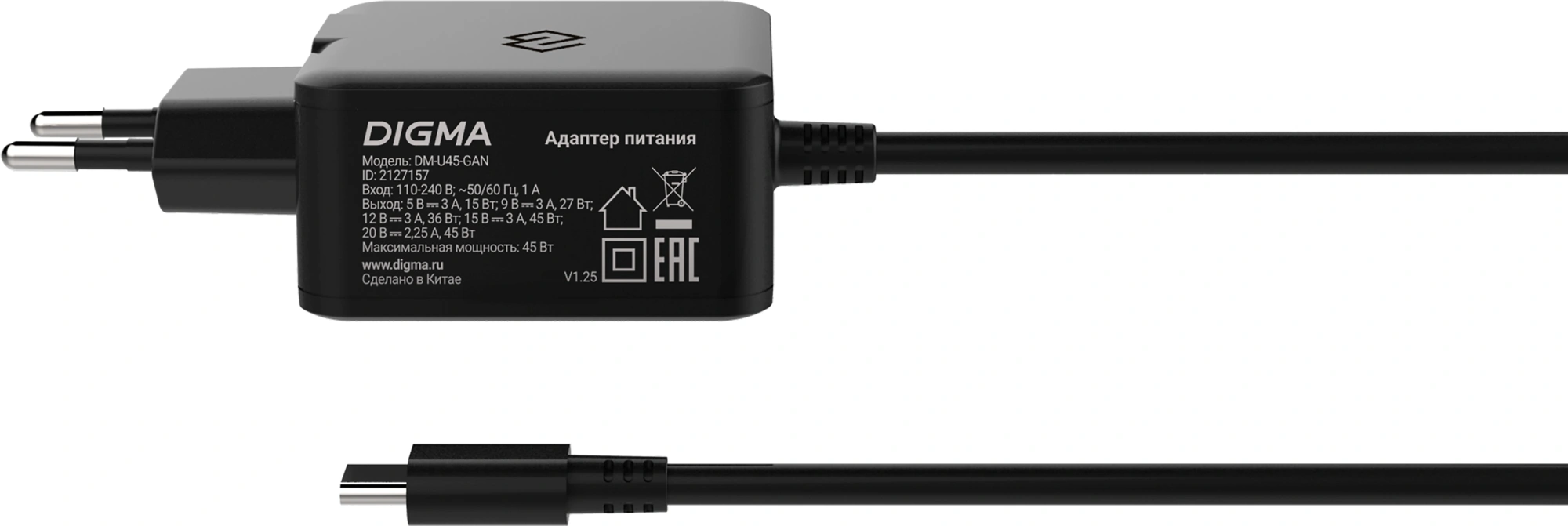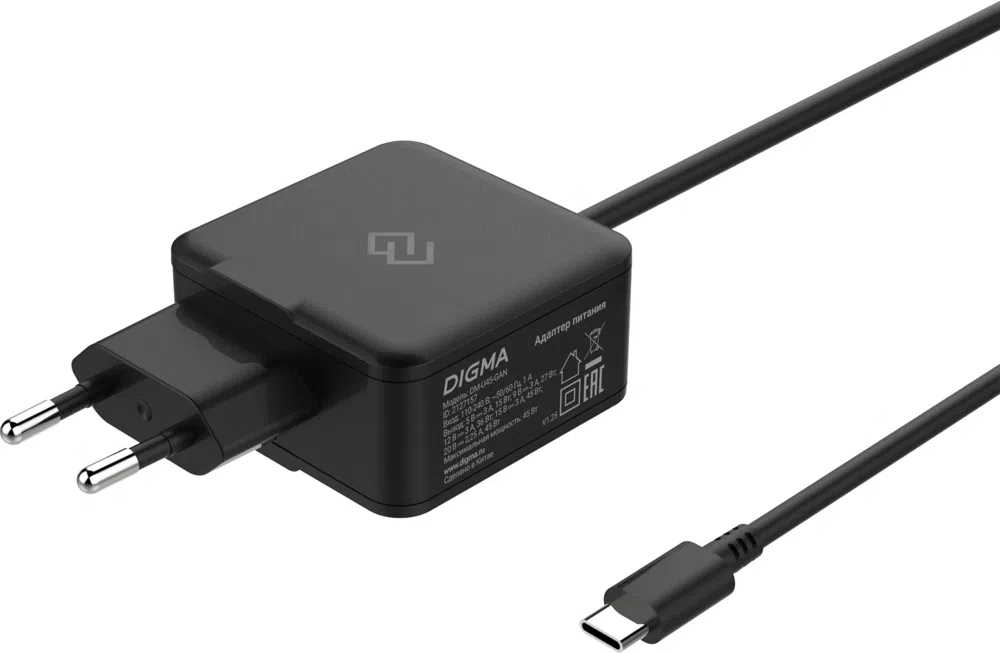 Блок питания Digma DM-U45-GAN автоматический 45W 5V-20V 2.25A от бытовой электросети