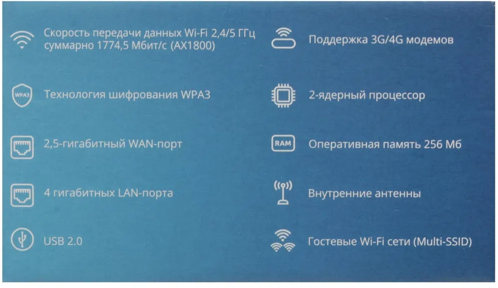 | Поддержка технологий | DHCP-сервер, DLNA, Dynamic DNS (DDNS), FTP-сервер, MESH, QoS, UPnP, VPN, WPS, поддержка IPTV, протокол IPv6 |