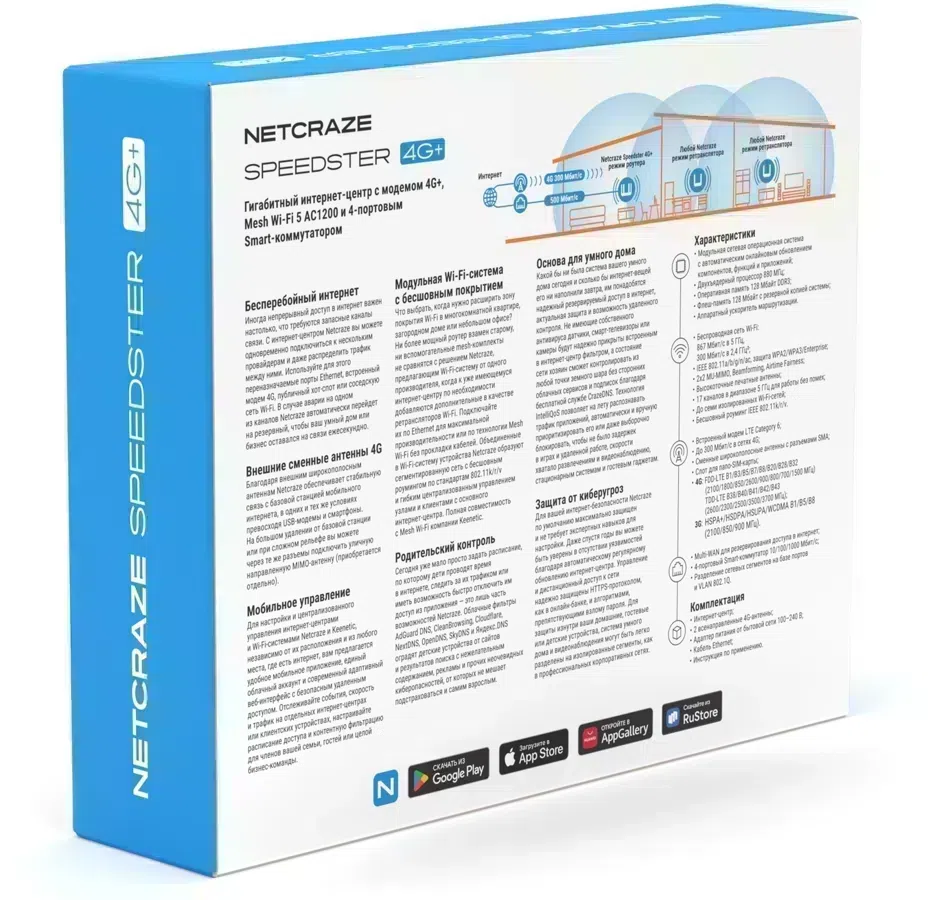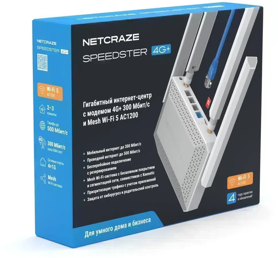 | Комплектация | Роутер беспроводной Keenetic Netcraze Speedster 4G+, 4G-антенны, адаптер питания: 12 В 1.5 A, кабель Ethernet, инструкция по применению. |