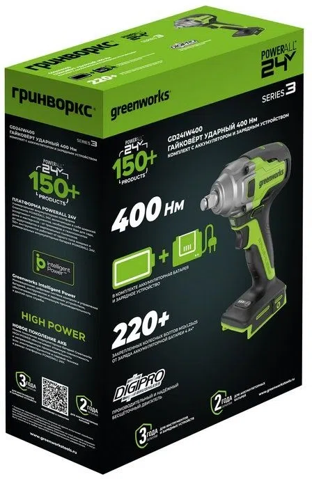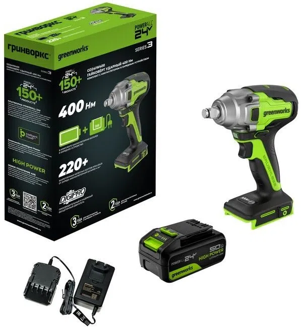 | Комплект поставки | Ударный гайковерт Greenworks GD24IW400,АКБ 5Ач - 1 шт.,Зарядное устройство - 1 шт.,Руководство по эксплуатации,Гарантийный талон,Картонная коробка. |
